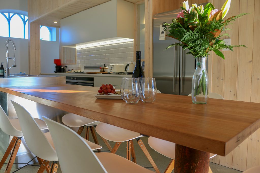 The tiler faced a tough challenge when it came to the steepled window of the master bathroom, the quality and finish of the craftsmanship required to complete this project is amazing. You’ll find that the previous Sunday School is fitted with a state of the art kitchen, finished with recycled rimu floor joists that have been reused in the skirting and the kitchen joinery.