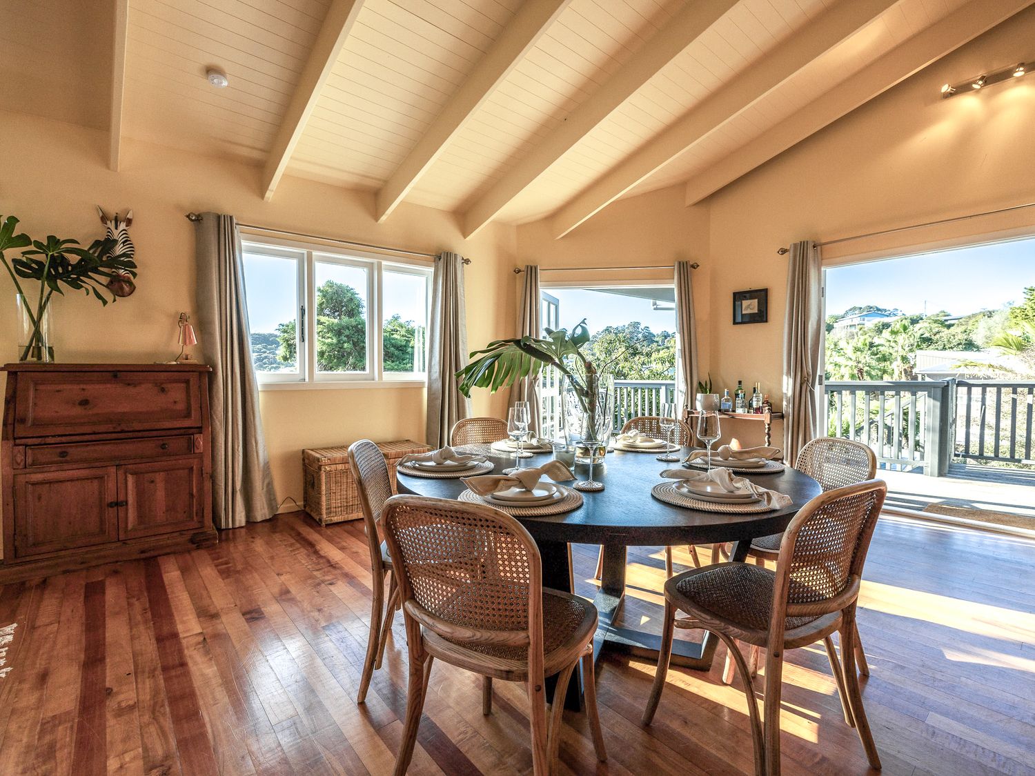 Perched just up the road from Surfdale Beach on Waiheke Island, this three-bedroom holiday home is a contemporary yet rustic spot to enjoy long summer