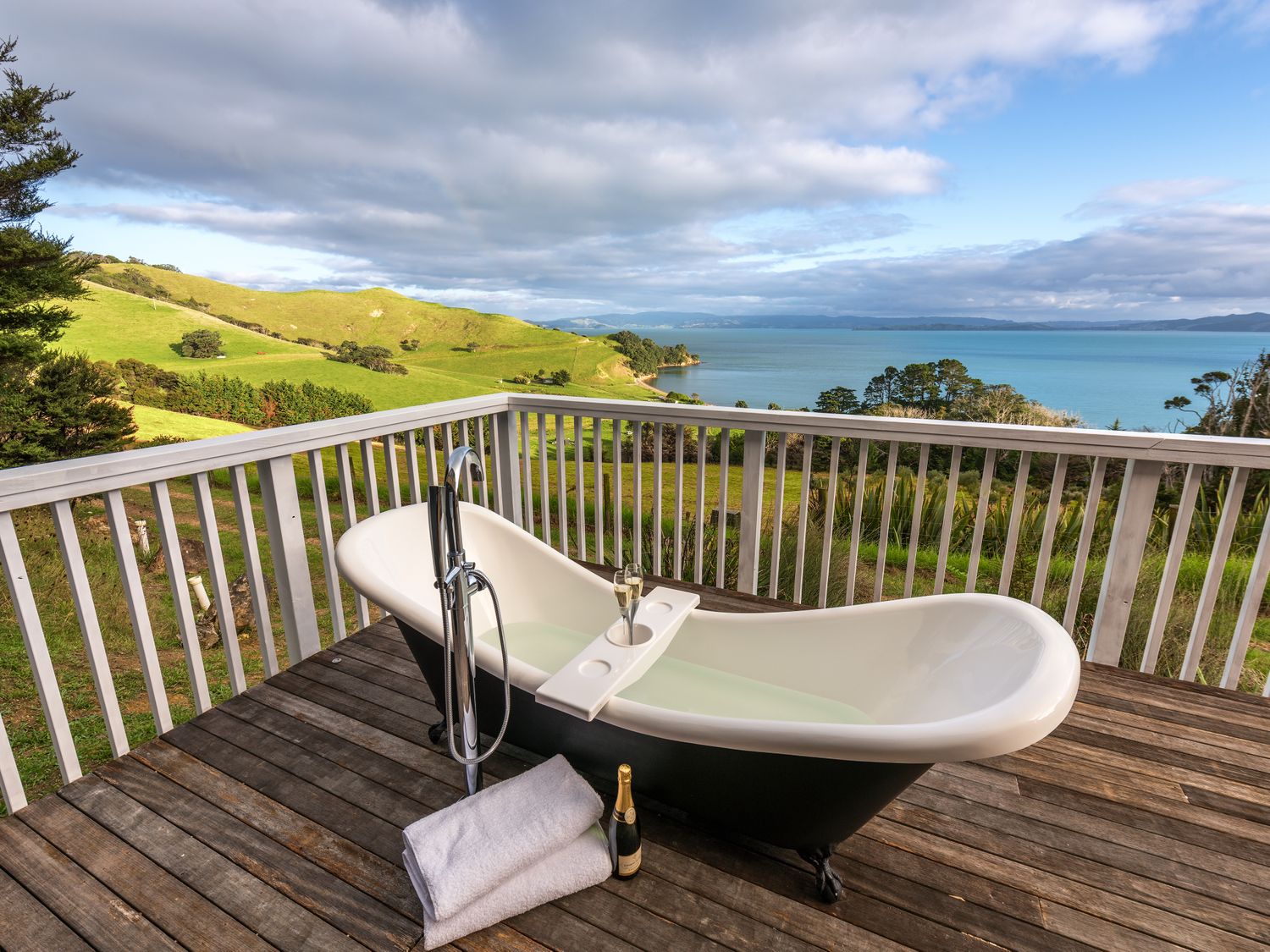 Step into a picturesque paradise at Woodside Bay Cottage – Perched harmoniously up on the hillside boasting phenomenal panoramic views out over the rolling hills