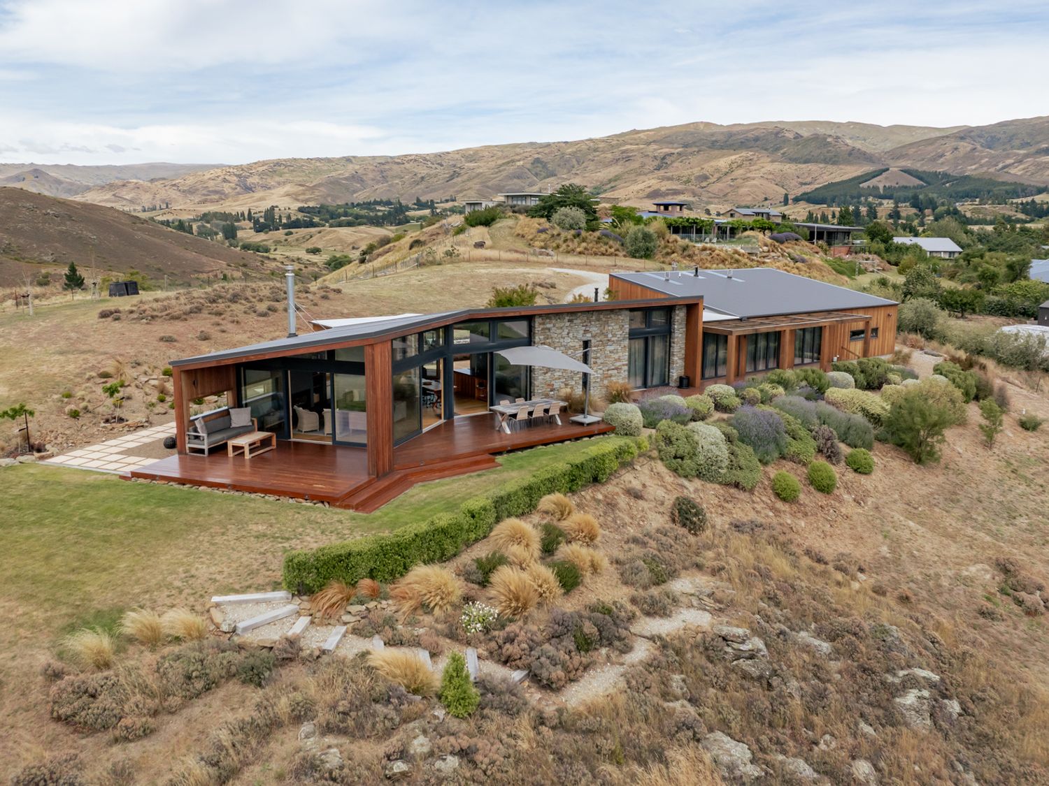 With some of the finest Central Otago wineries within walking distance and some of the finest Central Otago views from every window, this might just be the perfect luxury escape. Welcome to Vino and Views! As you open the door to this idyllic holiday home, prepare yourself for the breathtaking outlook that awaits. Floor to ceiling glass provides the perfect artwork for the open-plan living spaces, while stylish furnishings create a modern yet comfortable design throughout. Make yourself a cuppa and sink into the leather couch with a book; you might get a few pages to read if you can drag your eyes off the view. Or, get comfy in the TV room, log in to your Netflix account on the Smart TV and free WIFI, and catch up on that show everyone’s been talking about. The fully equipped kitchen offers everything you’ll need to prepare delicious holiday meals, or serve up a charcuterie platter to accompany the Pinot Noir you picked up at a local vineyard. A butler’s kitchen provides plenty of storage, and the open-plan design means no-one needs to be left out of the conversation. Four bedrooms offer everyone their own space to retreat to here at Vino and Views. Each with a queen bed and doors that open out to the balcony and its stunning valley views, the master also features an ensuite bathroom. A second bathroom offers a large shower, as well as a luxurious stand-alone tub to soak in. The whole home is kept warm and toasty on those mid-year getaways thanks to heat pumps and a heat exchange system. On those hot summer days either turn on the air-conditioning or open up the windows and doors and let the mountain breeze flow through. The outdoor living spaces here at Vino and Views are simply spectacular. With a long deck along the length of the house and a sheltered spot that wraps around the living room, there are a plethora of options to enjoy a glass of wine and good conversation. Spark up the BBQ and dine alfresco as the sun goes down. Vino and Views is perfectly located to enjoy the nearby vineyards, restaurants, and cafes, while still offering you your own slice of paradise to enjoy. Cromwell is only five minutes away by car, and a nearby river inlet is ideal for jet-skiing and swimming. There are also lovely walking trails offering the perfect spot to stretch the legs and take in the scenery. Prepare yourself for lashings of luxury and a panoramic vista you won’t want to leave. This is Vino and Views.